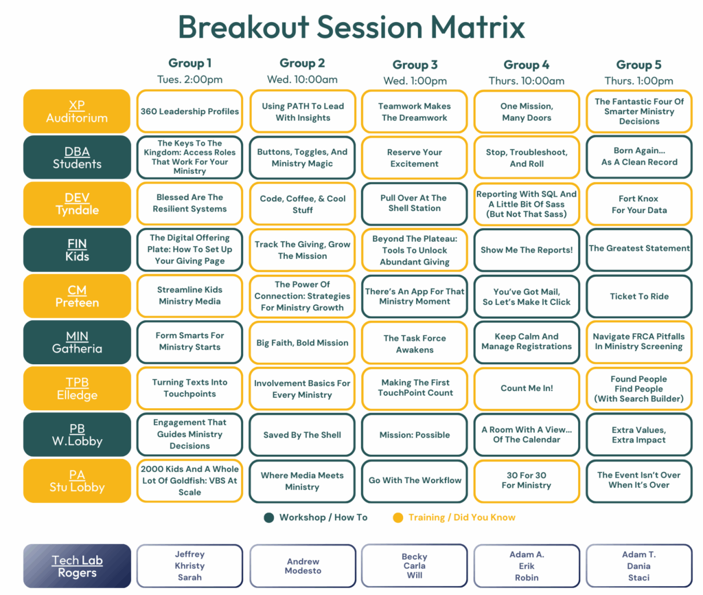 This Summit will have tracks with information suitable for the Executive Pastor, Database Admins, CFO/Finance Team, Developers, Ministry Front Lines (children’s/missions/small groups/congregational care), Communications Teams, and those who are New To TouchPoint.