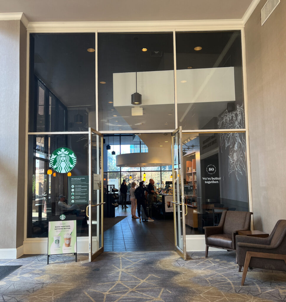 Get your morning started right with coffee from the spacious Starbucks located in the Fairmont lobby. There’s also an onsite restaurant and plenty of seating sprawling across the main floor.