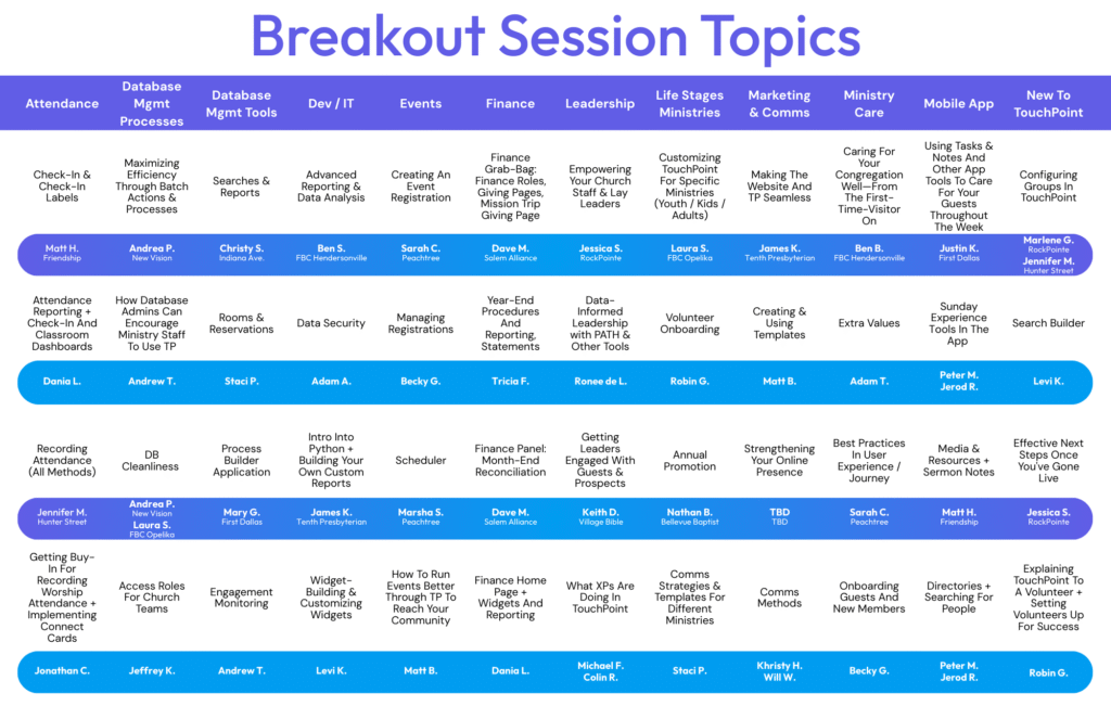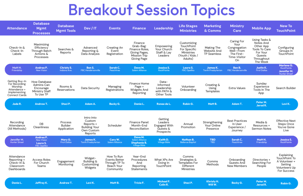 This Summit will have tracks with information suitable for the Executive Pastor, Database Admins, CFO/Finance Team, Developers, Ministry Front Lines (children’s/missions/small groups/congregational care), Communications Teams, and those who are New To TouchPoint.